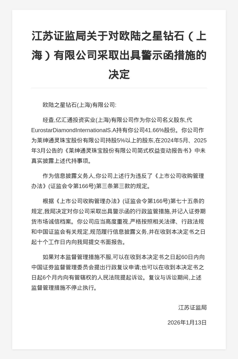 对此,江苏证监局决定对欧陆之星钻石(上海)有限公司采取出具警示函的行政监管措施,并记入证券期货市场诚信档案。