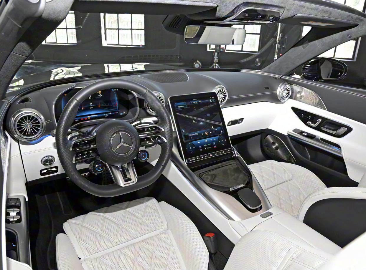 全新AMG SL65车内采用了大面积黑色Nappa真皮材质额铺陈,还加入了手工橙色双缝线设计,还有大面积碳纤维装饰面板和亮黑色钢琴烤漆装饰面板,就连地毯都加入了植绒面料,内侧的门板还带有AMG的银色金属徽标。中控台配备了AMG专属的小尺寸多功能方向盘,真皮打孔材质的包裹拥有更加柔和细腻的手感,防滑吸湿性也会更好。配备了12.3英寸的LCD全液晶仪表和12.8英寸的中控液晶大屏,仪表盘支持裸眼3D效果,搭配着HUD抬头显示屏还自带AR增强现实功能,效果酷炫。中控屏采用了OLED技术,还配备了360度影像,甚至还有赛道计时器,更加符合年轻人的审美。