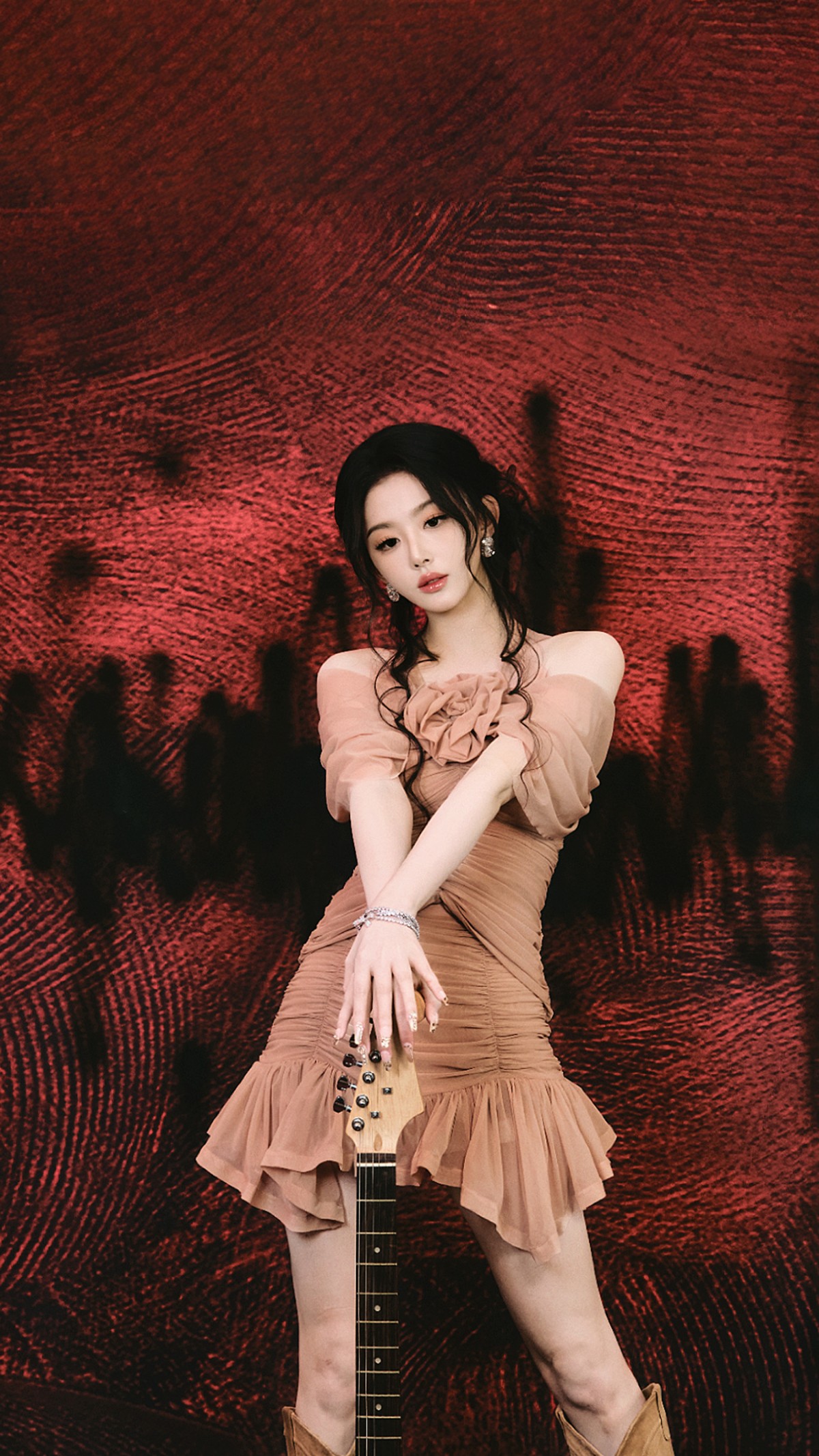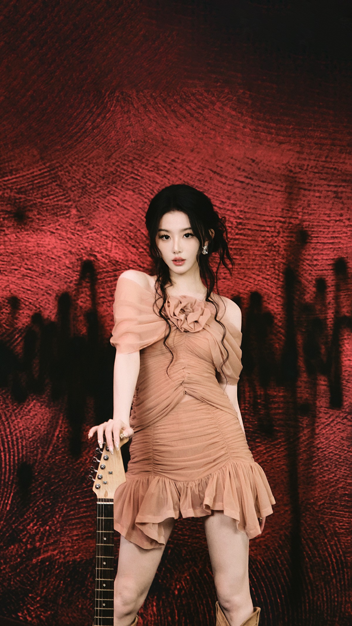但真正让全场瞳孔地震的,是她手里那把电吉他!想象一下:软萌脸蛋 + 硬核乐器,甜度和酷感直接对撞出火花四溅的化学反应。站在红色波纹背景前,她眼神里没有一丝犹豫,全是“老娘说了算”的笃定。这一刻,她不是在拍照,是在宣告:舞台是我的,风格我定义!